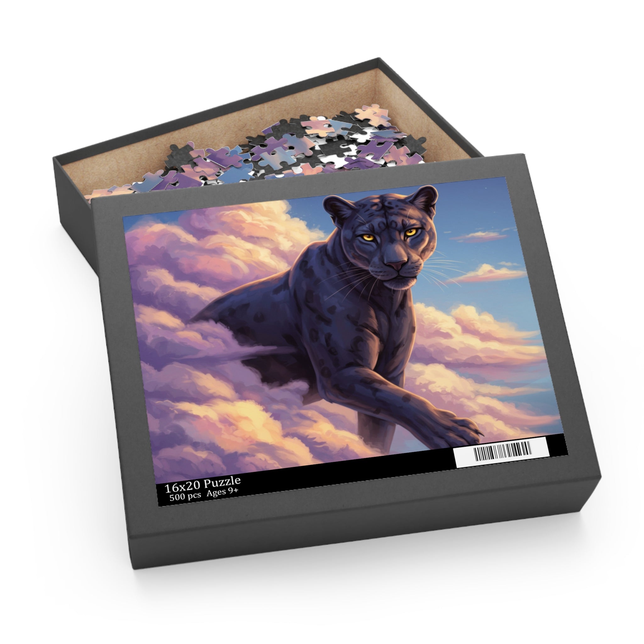 Lose yourself in twilight with this artful puzzle that brings a majestic black panther gliding through cotton-candy clouds to life. Each piece snaps into glossy, vividly printed chipboard that preserves every brushstroke and twilight hue. Work through 120, 252, or 500 pieces as the scene slowly reveals itself: the panther’s calm, amber gaze, the soft mauve and gold of sunset clouds, and the painterly texture that makes the image feel both dreamy and alive. Packaged in a compact paper box that shows the finished artwork, this puzzle invites quiet focus, gentle satisfaction, and the slow reward of completing a scene that feels like a secret sky-world.