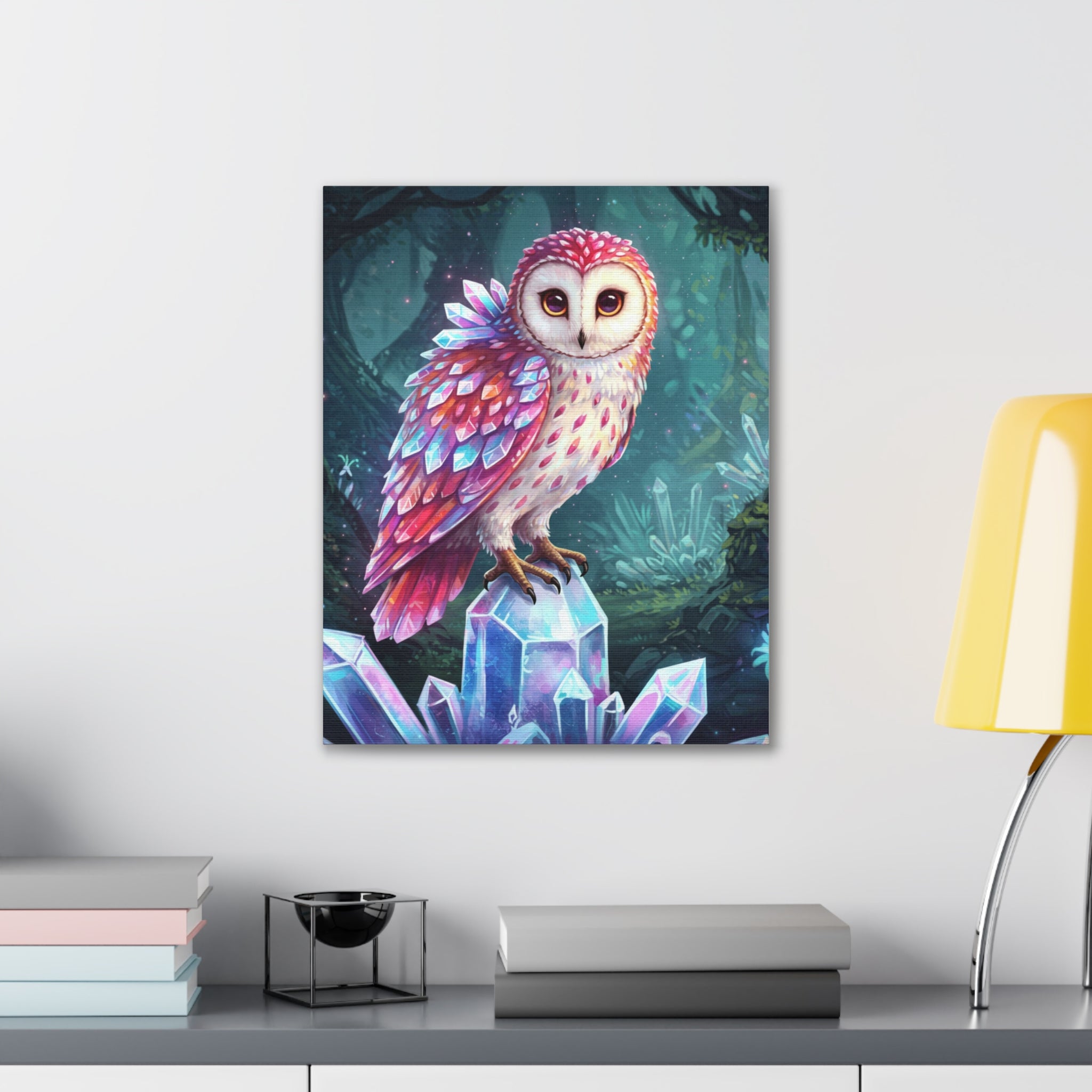 A stretched canvas art print that brings a touch of enchanted forest into any room. The vivid illustration of a jewel-toned owl perched on crystalline stones draws the eye with luminous color and fine detail. Mounted on a sturdy pinewood frame and finished with bright, fade-resistant inks, this piece hangs straight from included hardware and gives walls a whimsical, gallery-ready look. It suits cozy reading nooks, creative studios, and bedrooms where wonder and calm matter — the kind of artwork that invites a quiet, nightly pause and sparks conversation without shouting for attention.