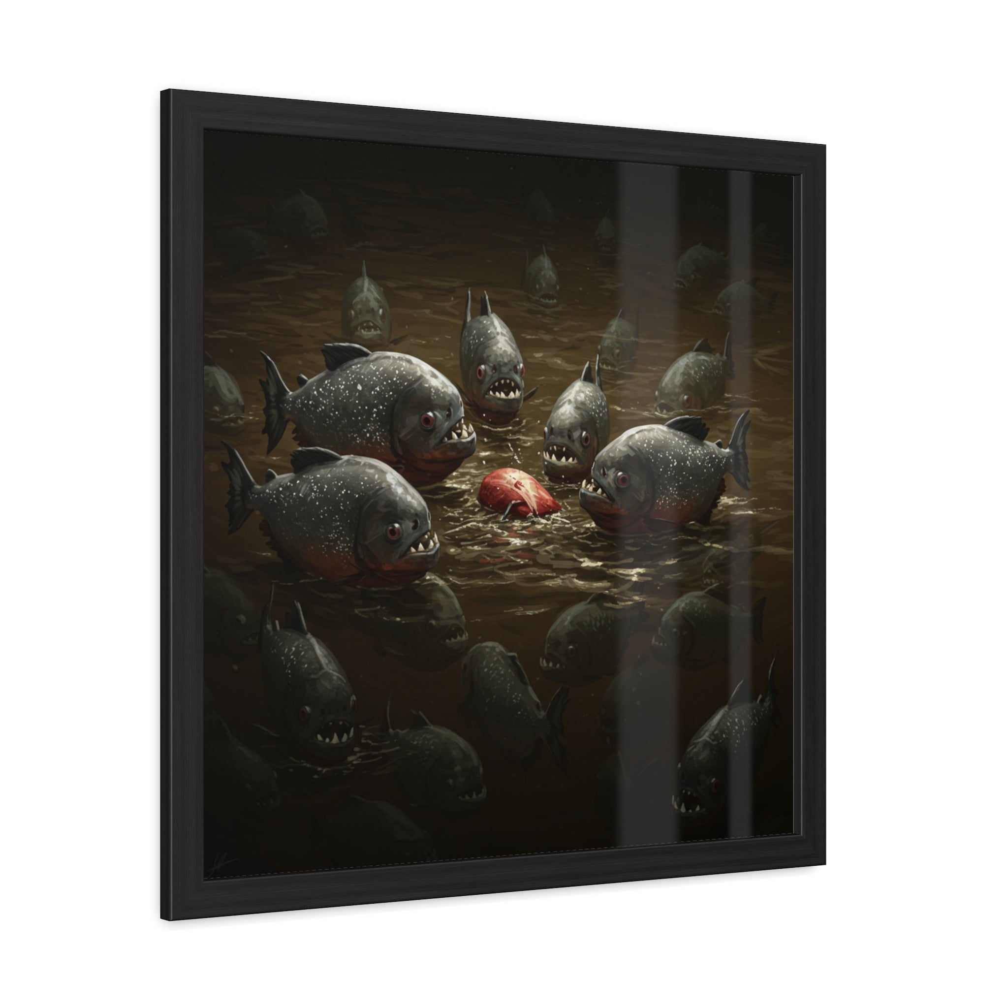 A framed art poster that pulls the room into a dark, cinematic moment — a taut scene of churning water and watching eyes rendered in deep, luminous tones. The semi-gloss paper and Mimaki UV inks give each shadow and splash a crisp, textured depth, while the clear Perspex cover keeps the surface glass-smooth and reflective. Hand-crafted wooden framing and an enclosed hanging kit mean the piece arrives ready to take its place on a gallery wall, corridor, or study — a conversation-starting focal point that brings tension and atmosphere to any space.