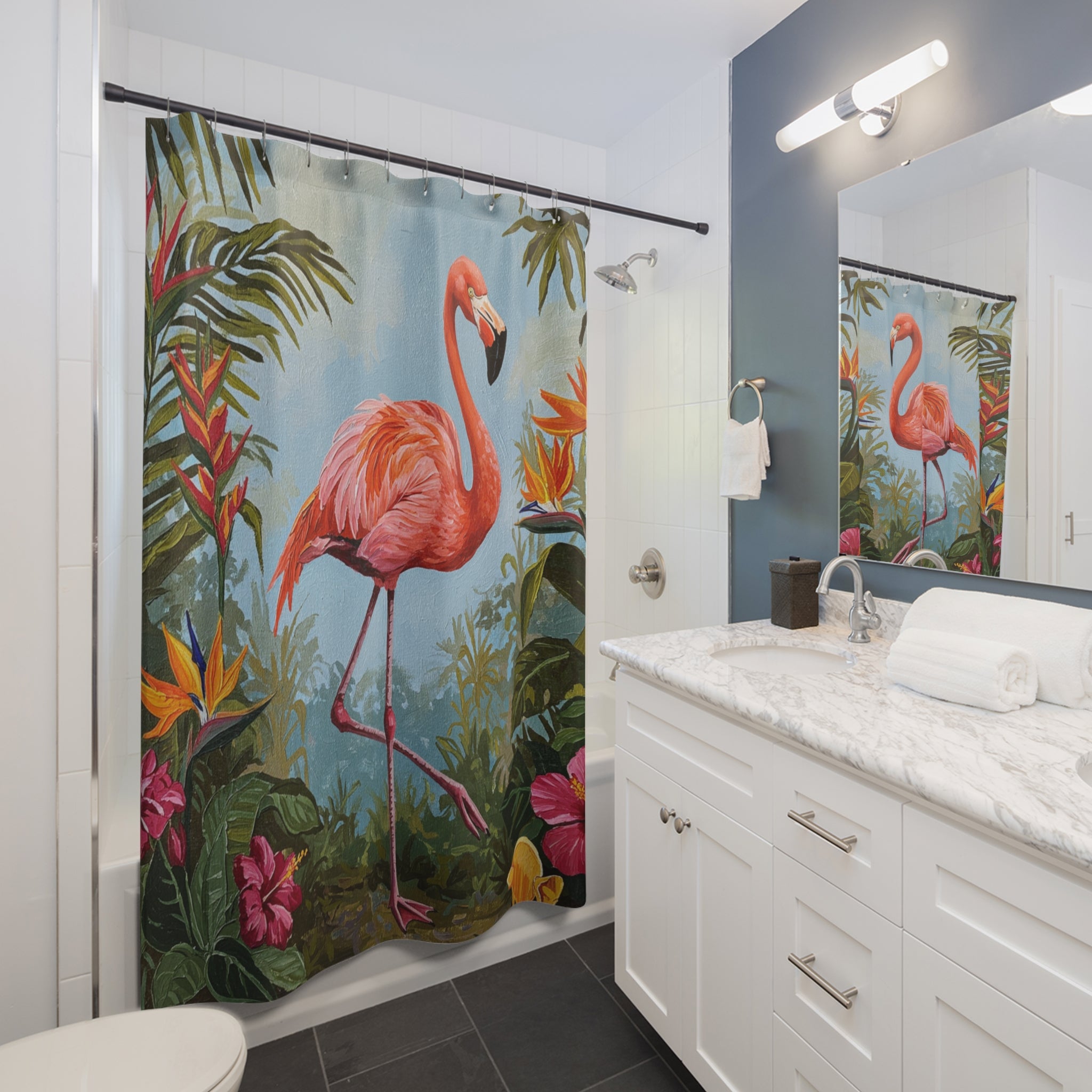 Bright, painterly flamingo art meets everyday bathroom routine. This polyester shower curtain frames your tub with a single, elegant flamingo standing amid lush tropical foliage and blooms. The one-sided print shows rich pinks and coral feathers against a soft sky-blue background, bringing warmth and a relaxed island vibe to small bathrooms or guest baths. It moves softly with the steam, adds color without overwhelming, and folds away when you want the room to feel open again. Hang it for a weekend reset, a summer refresh, or whenever you want a little cheerful escape during your morning routine.