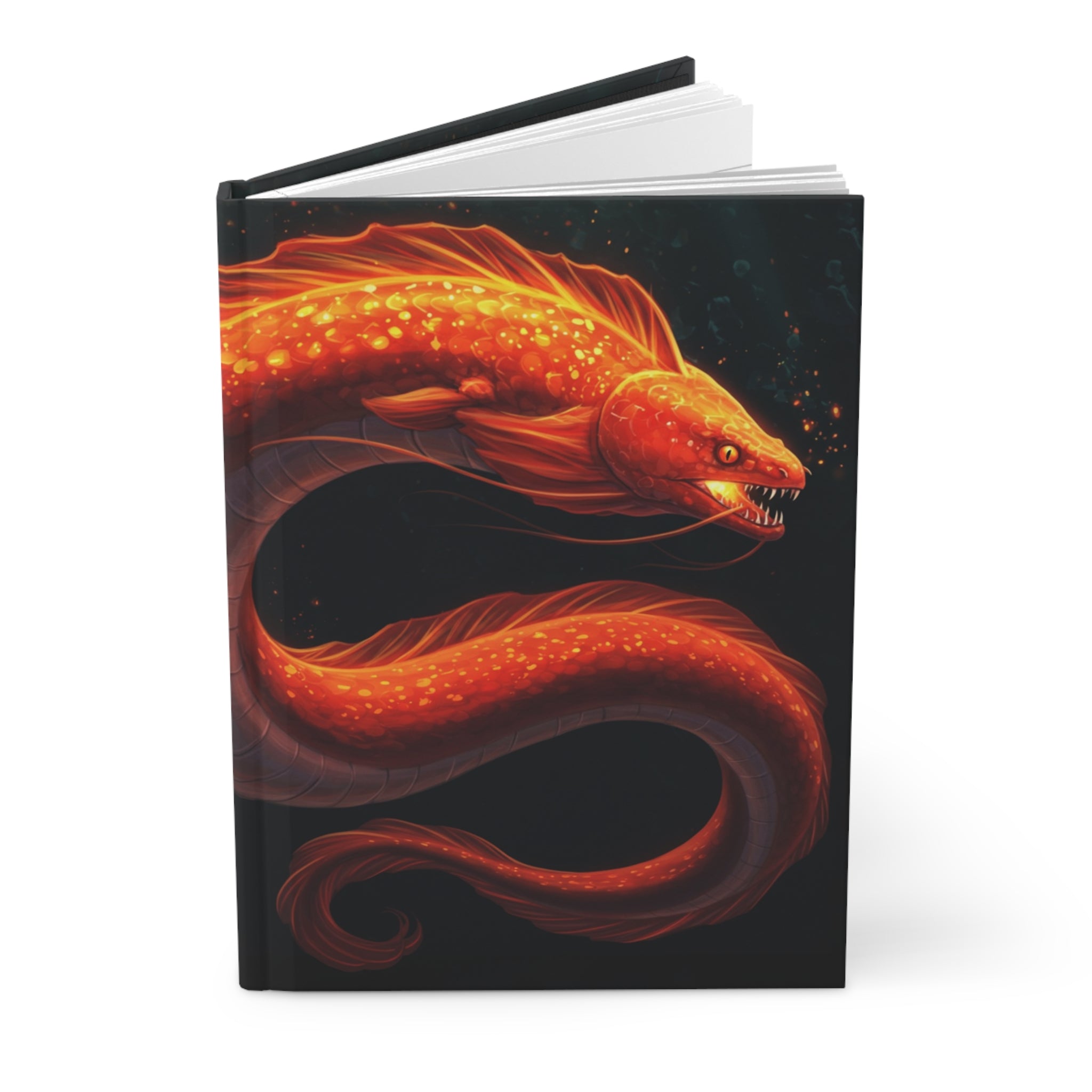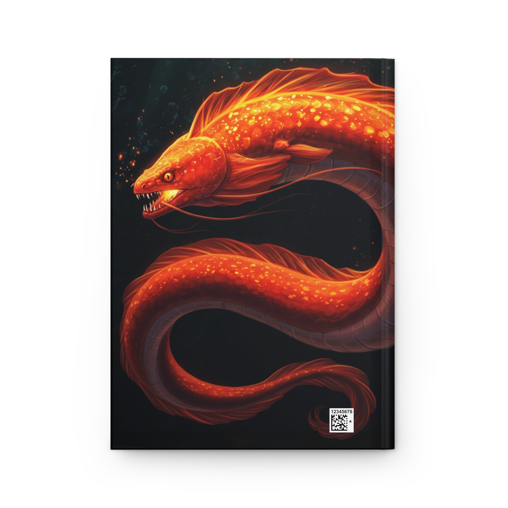 Ink-dark pages meet a living ember on the cover. This hardcover journal wraps a sinuous, fiery sea serpent across a matte-laminated surface that feels smooth under your fingertips and resists scuffs as you carry it. Inside, 150 lined pages with handy perforations give you room for long-form thoughts, quick lists, and pages you might tear out to share. The sewn casewrap binding lets the book open flat and handle many sessions of writing, while the full wraparound print keeps the creature coiled across front and back — a quiet companion for late-night reflections, sketching, or plotting your next creative dive. A small production barcode sits on the lower back cover.