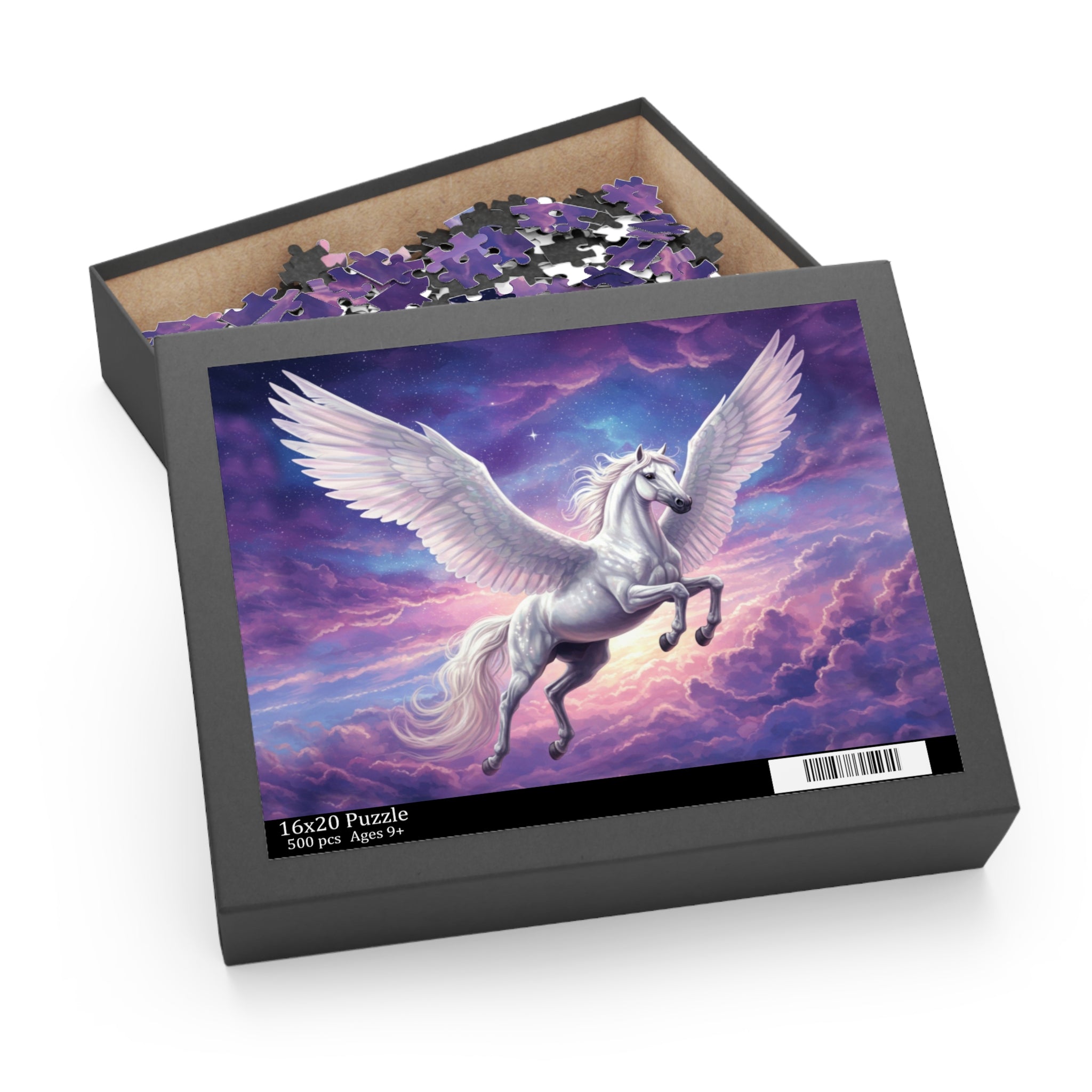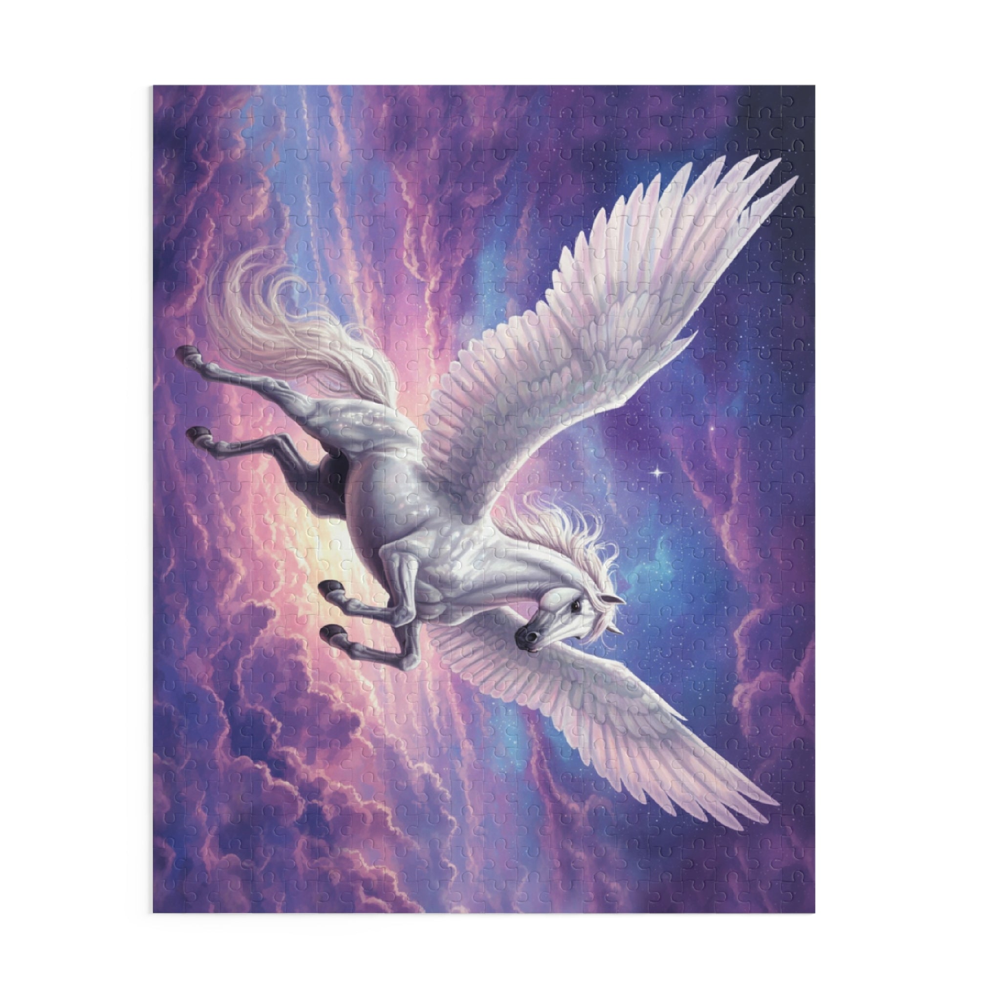Float into a sky of lavender and starlight with this shimmering Pegasus puzzle. Each glossy piece snaps together to reveal a majestic winged horse soaring among cotton-candy clouds and a twilight wash of purples, pinks, and soft blues. Putting it together becomes a quiet, immersive ritual — tracing the feathered wings, following the mane’s flow, and uncovering the glow around the horizon. This puzzle suits anyone who loves fantasy artwork, calm evening vibes, and the slow pleasure of creating a scene that feels both dreamy and triumphant. It arrives in a printed paper box that showcases the finished image, so it’s ready to display or tuck away for a cozy puzzle night.