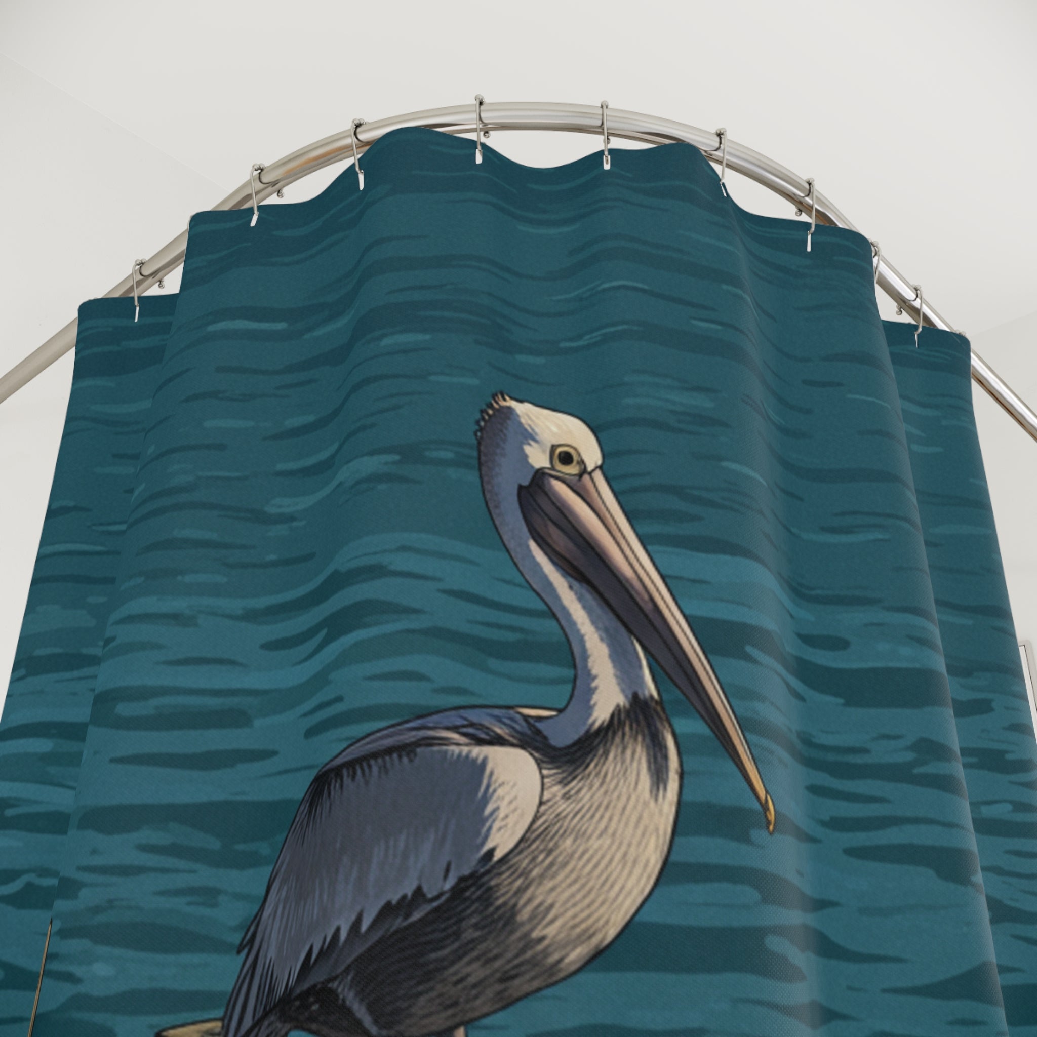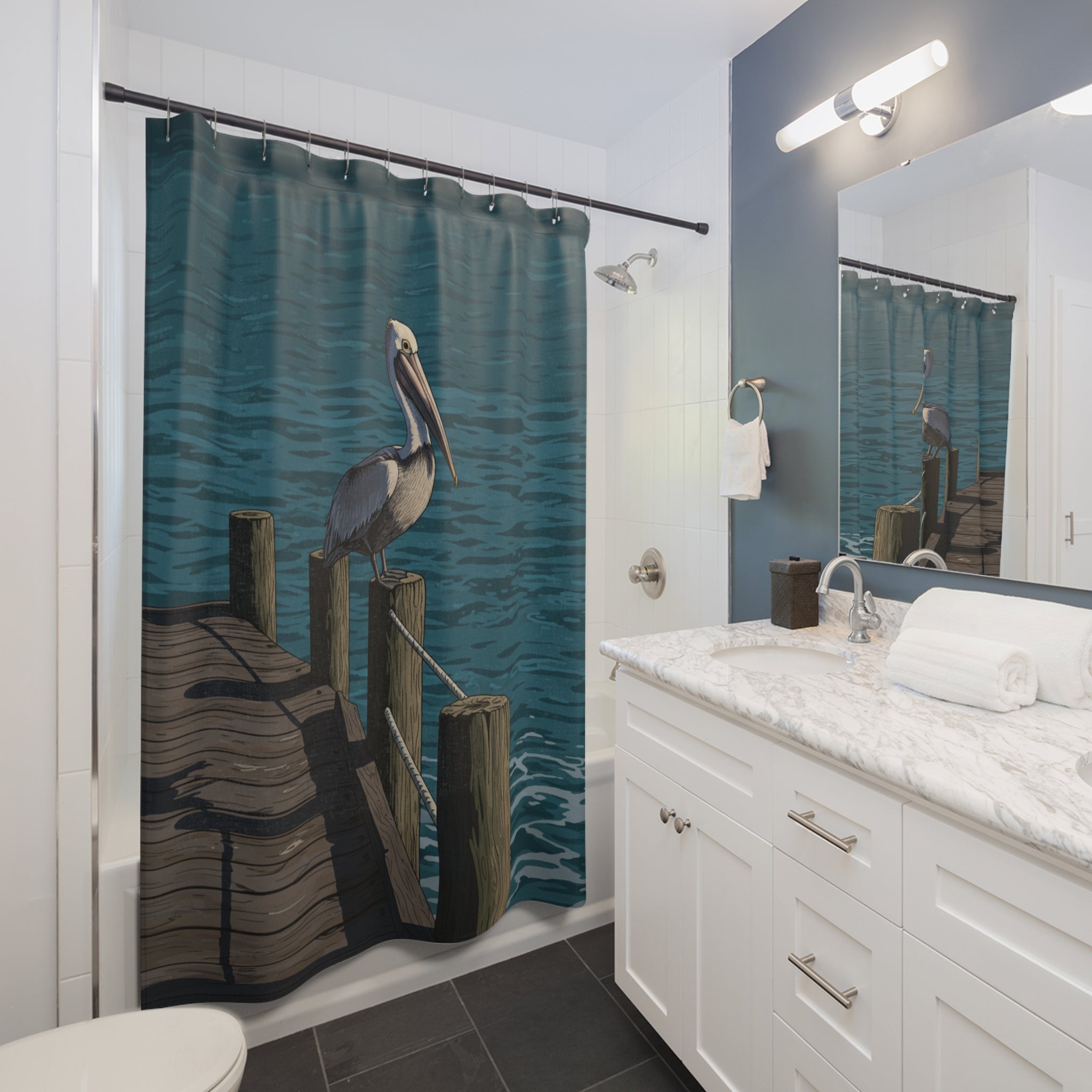 Bring a calm, coastal morning into your bathroom with this artful shower curtain. A solitary pelican perches on a weathered dock as deep teal water ripples behind—an image that hushes the room and invites a slow, reflective start to the day. The printed side captures fine sketch-like details and muted, sun-washed tones that pair naturally with wood or driftwood finishes and sandy accents. It’s built to endure daily use while keeping the mood serene: quick-drying polyester and reinforced buttonholes mean it hangs straight and lives worry-free in a busy household. Hang it when you want the feel of a quiet shoreline, whether you’re easing into a weekend or freshening a rental or beach house.