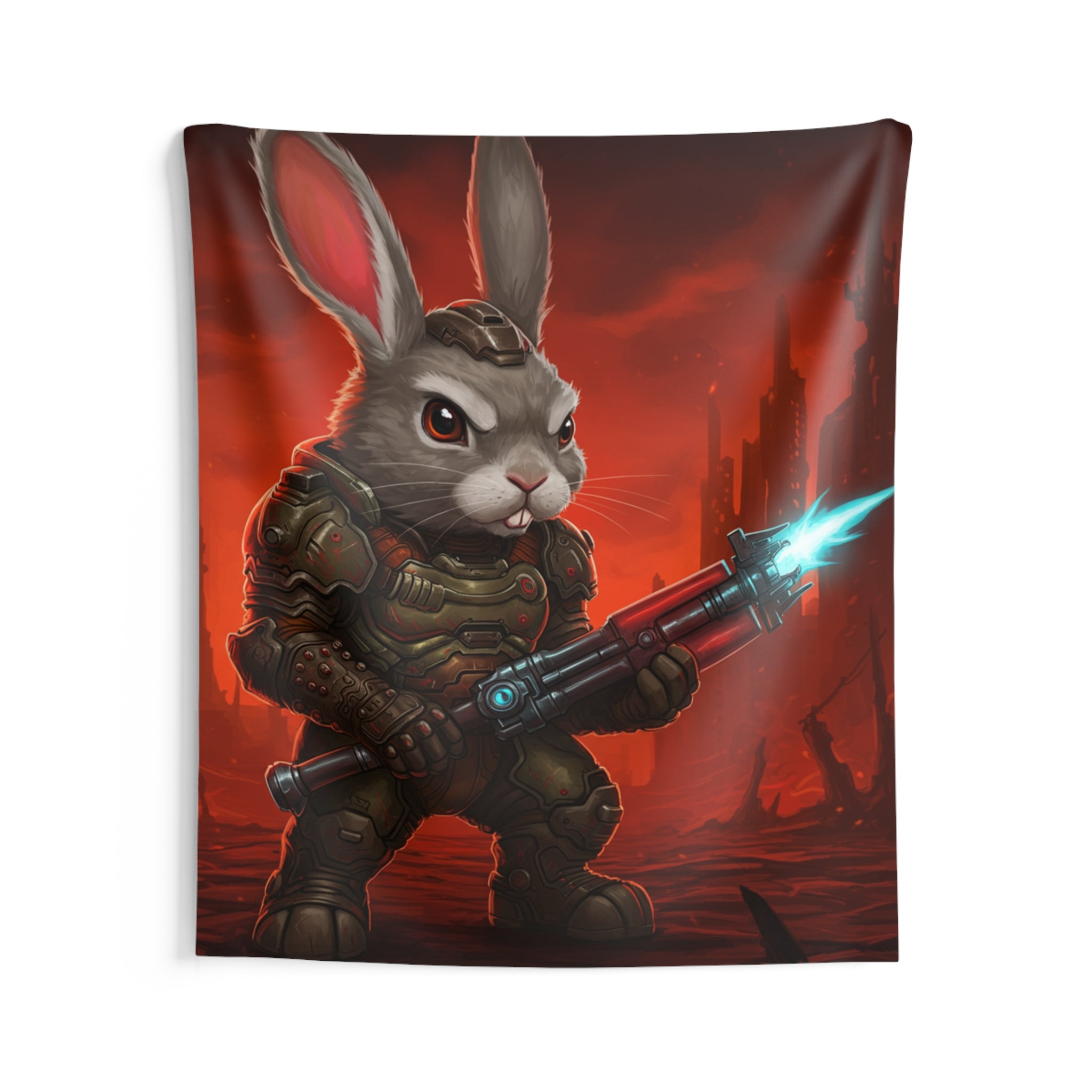 Bring a touch of playful heroism to your walls with this bold indoor tapestry. A fierce, armored rabbit stands against a smoldering, otherworldly skyline — a mix of whimsy and sci-fi grit that draws the eye and sparks conversation. The rich crimson and deep shadows create a dramatic focal point that works in gaming dens, studio spaces, or anywhere you want personality and attitude. Lightweight yet durable polyester prints the artwork with crisp color and defined detail, hanging smoothly thanks to hemmed edges and available in multiple sizes to suit cozy corners or full accent walls.