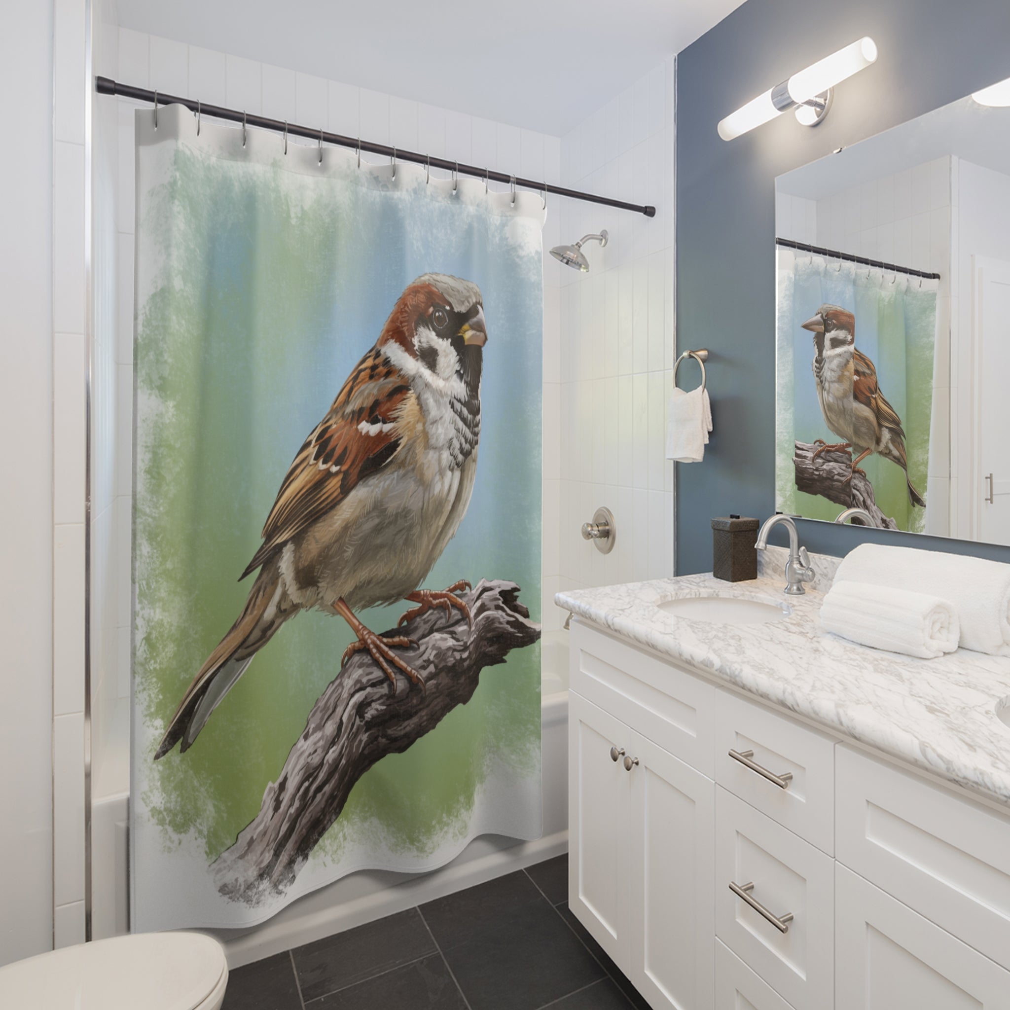 Let this charming sparrow bring a quiet, nature-filled moment to your bathroom. Printed in warm, painterly detail on quick-drying polyester, the curtain captures a lively little bird perched on weathered wood against soft, watercolor greens and blues. It transforms a daily routine into a calm pause—perfect for someone who notices small things: the tilt of a head, the ruffle of feathers, the hush of dawn. The single-sided print keeps the image vivid where it matters, while durable fabric resists wrinkles and dries fast after showers. Easy to hang through twelve reinforced buttonholes; hooks sold separately. Size may vary slightly due to pre-construction, adding to its handmade feel.